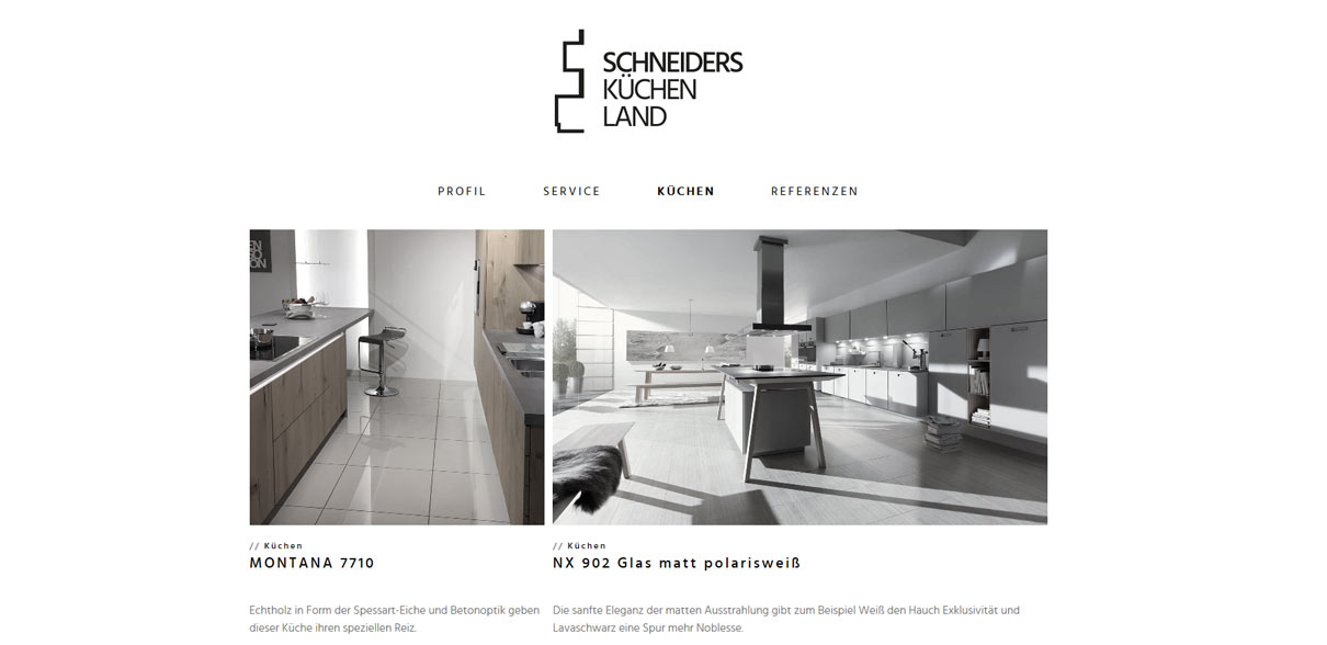 Schneiders Küchenland steht für moderne, zeitlose und coole Küchen. Das alte Logo und die zugehörige Website spiegelten das aber in keinster Weise wieder. So hatten wir von einseinsvier eine dankbare Aufgabe: Ein Logo und Markenauftritt zu entwickeln, der genauso clean und cool sein sollte, wie die Küchen, die Harald Schneider seinen Kunden einbaut. Unser Kunde und auch wir selbst sind sehr zufrieden mit dem, was entstanden ist.