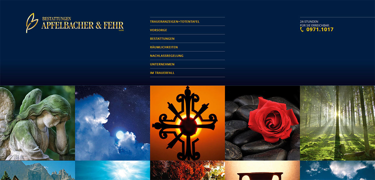 Apfelbacher und Fehr Bestattungen aus Bad Kissingen wollte ein individuelles Layout angepasst an das restliche CD. einseinsvier setzte die Seite als responsive Design im CMS Joomla um.